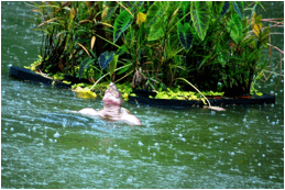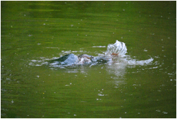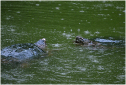 I quickly put down my umbrella and took out my camera under the protection of Anderson Pavilion. I was afraid that the turtles would disappear any time. It appeared that they were having great fun. No, it was as if they were fighting with each other, splashing waters around them. I took about ten minutes of photos. Though my camera did not have the ability to zoom in as close as I wished, I could see that the two turtles went through several cycles of approaching each other, playing and fighting vigorously, splashing waters around them, and then embracing each other and floating and turning together gently in the water. What were they doing? Were they enacting the mating dance?
