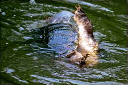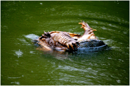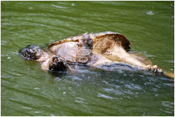 “The snapping turtle can grow to a very large size, 20-40 cm (8-16 inches) on average. Its shell is dark brown, rough and usually covered in algae. The snapping turtle can be found in waters ranging from slow moving rivers to stagnant ponds. Although this turtle has received a bad reputation for allegedly biting swimmers and eating baby ducks, in reality it is very shy in the water and will retreat from anything except lunch.”