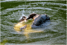 I was really amazed why they had so much energy playing, fighting, and making love for such a long time. I saw many cycles of the play. After about one or two or three minutes of relatively quiet time of embracing each other and floating and turning over in the water, without splashing much water, they would separate from each other. After roaming for a while, they would approach each other again, chasing, playing, fighting, and then embracing.