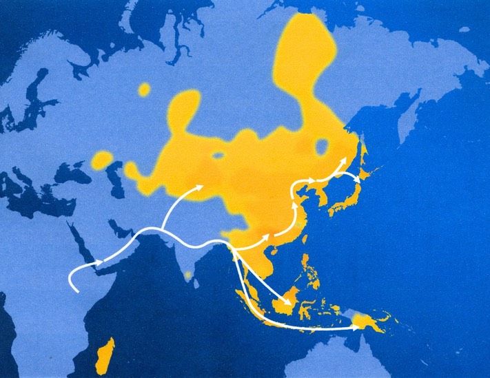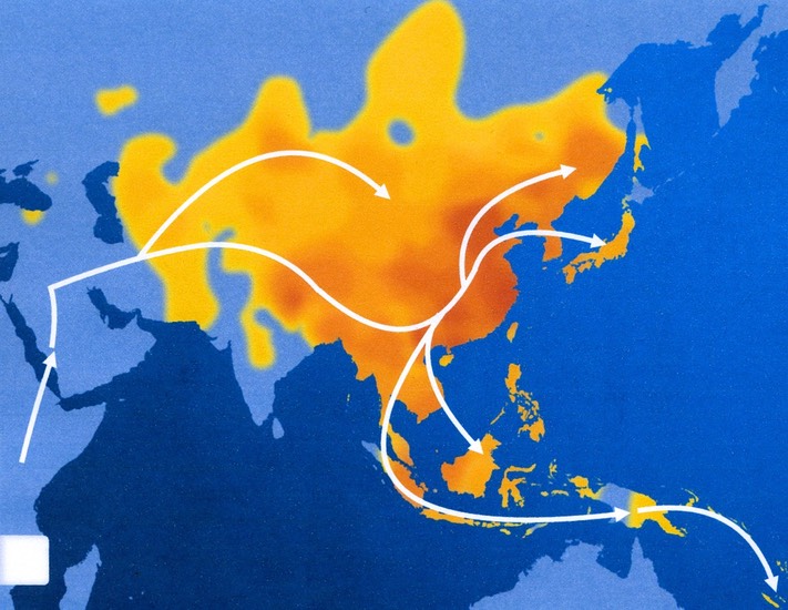The Heatmap above shows how the people of M122 are found in the world today, mainly in Asia. The arrows represent the possible migration paths of M122. The color of yellow is about 10% and red about 80% of frequency or percentage of M122 people in a given area.